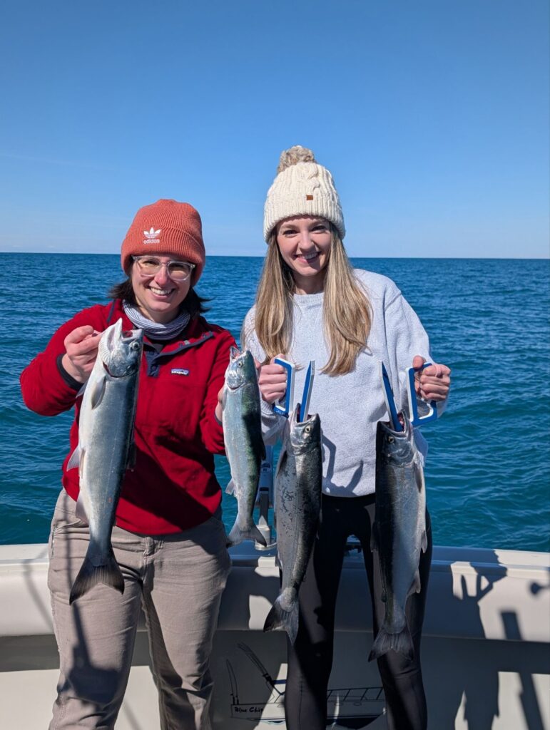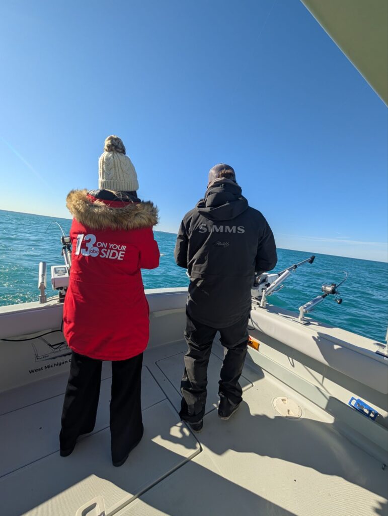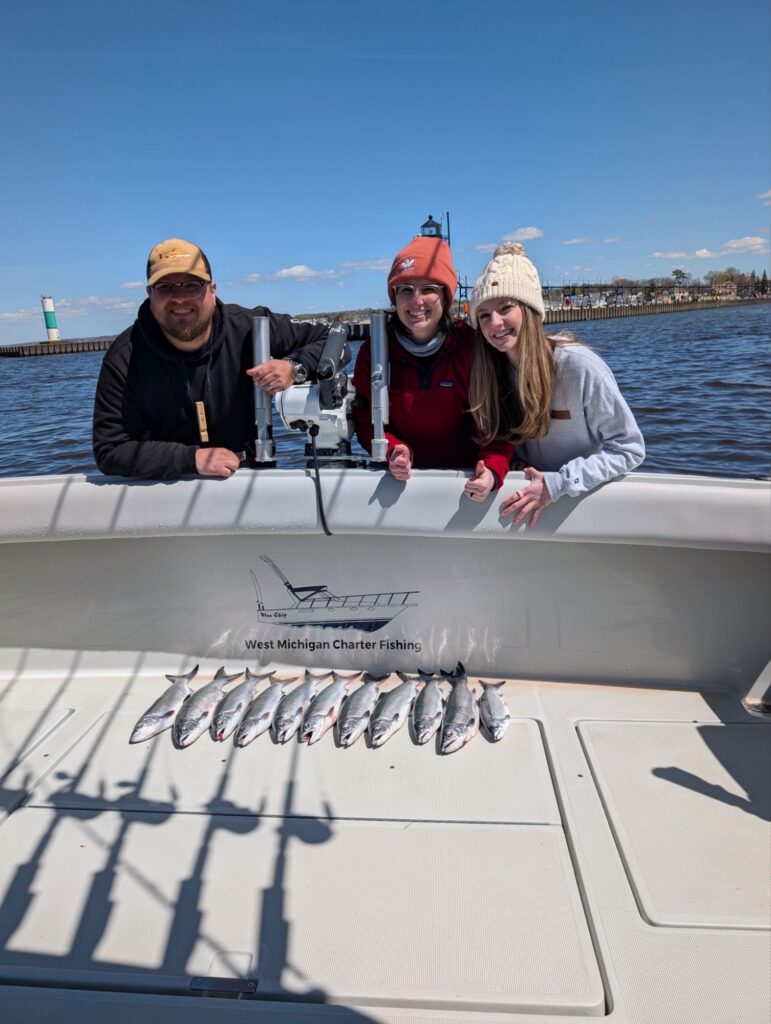 Today we were joined by channel 13 News in fishing from the port of South Haven. Not only was it a beautiful day but it was our opening day of fishing for the year on lake Michigan and it did not disappoint as we caught 11 cohos and a King Salmon. To start the morning we set up in 50 ft to notice that the water had gotten quite dirty over the last couple days with the wind. With that being said we headed west in search of some clean water. There were a few definite color breaks starting in 140 ft of water which held fish and we continued to cross color breaks clear out to 180 ft taking fish. Overall the best water was 140 to 160 ft our best rods were thin fins 70 ft behind Dreamweaver ninja boards. Seems like they wanted Orange today which is typical with the dirty water. Short blood Run coppers were a close second in adding to our cooler. Dream Weaver super slims in slurpee and magic Man both had a couple bites today also. Rigger bites were 20 and 30 ft down taking a couple bites each on 6 inch orange spin doctors. It seems as if the water is starting to set up and some fish are starting to show up we anticipate it getting better from here on out.